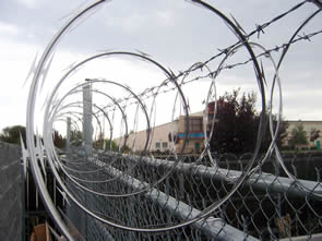 Razor ribbon barbed tape (Helical coil razor) is a simple spiral, like a spring or slinky. It is one of our major razor wire strip products. The loops are normally not clipped together in concertina fashion. This allows the razor wire coil to be installed in any distance between loops, depending on the security desired. This helical style is generally used for lower level security.